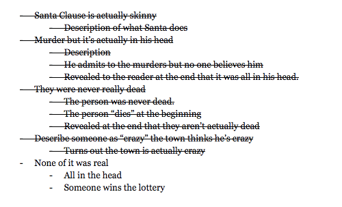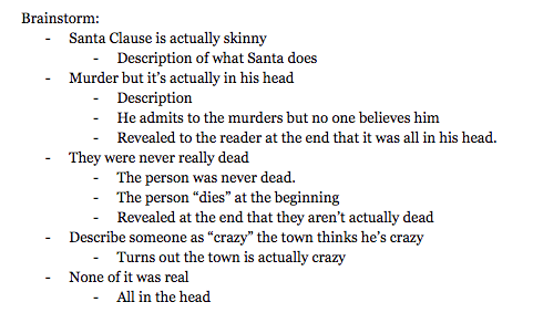 This is the brainstorm for my story with a short twist at the end. Here, I am brainstorming the different twists that I can place at the end of the story. I am also thinking of the different twists that could happen.